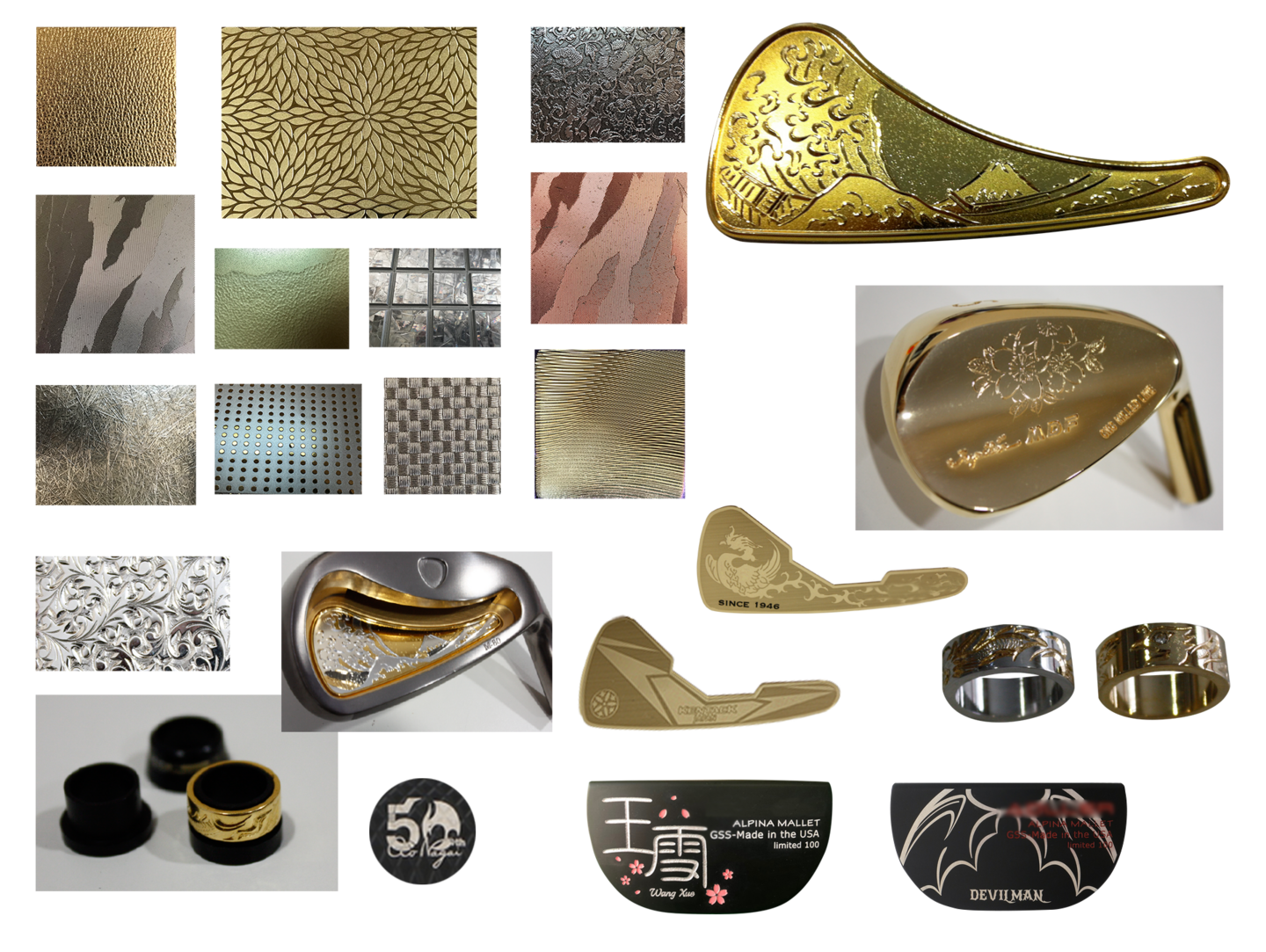彫刻、ホーゼル刻印、機械加工、レーザー彫刻(3D印字、全周印字、深彫印字)、インナーマーキングなど国内で丁寧に加工致します。また、ゴルフヘッドのプレートも製造が可能です。特殊技術により、ご要望に応じた凹凸の深いデザインを表現を得意としております。